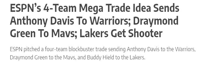 ESPN提出的交易框架具体交易方案如下:金州勇士队得到:安东尼·戴维斯、梅森·普拉姆利;达拉斯小牛队得到:德雷蒙德·格林、乔纳森·库明加、勇士队2026年首轮选秀权;洛杉矶湖人队得到:巴迪·希尔德;夏洛特黄蜂队得到:马克西·克莱伯、道尔顿·克内希特、湖人队提供的现金补偿。理论上,这是一笔充满话题性的交易方案,但现实层面的考量远比纸面分析复杂。